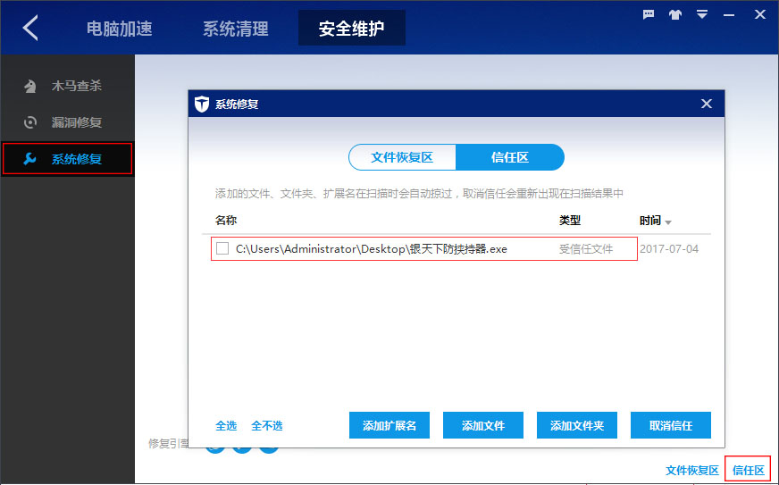 点击主页面右下角的“安全维护”,进入后,在左侧选择系统修复,再点击右下角的信任区。,将“银天下防挟持器.exe”文件。