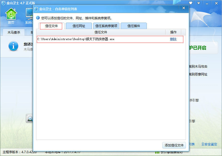 四、杀毒程式、安全卫士等 误删压缩包或EXE文件:只需将“银天下防挟持器.exe”添加进入信任列表即可,详细如下: